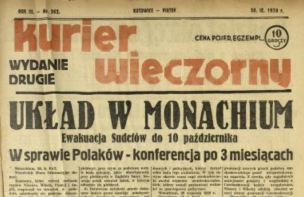 „Układ w Monachium. Ewakuacja Sudetów do 10 października”, „Praga przyjęła”, „Cztery fazy ewakuacji kraju sudeckiego”, „Sudety przechodzą do Rzeszy Niemieckiej”, „Wyniki obrad w Monachium”, „Pokój za olbrzymią cenę”, „Zjazd czterech w Monachium rozpoczęty”, „Jeszcze jedna próba ratowania pokoju. Mussolini-Chamberlain-Daladier dziś u Hitlera”, „Pierwsza konferencja przy drzwiach zamkniętych” oraz „Narady zakończono o 1.30 po północy”. To kolejne tytuły polskich gazet z przełomu września i października 1938 roku, poświęconych wydarzeniom związanym z kryzysem sudeckim.